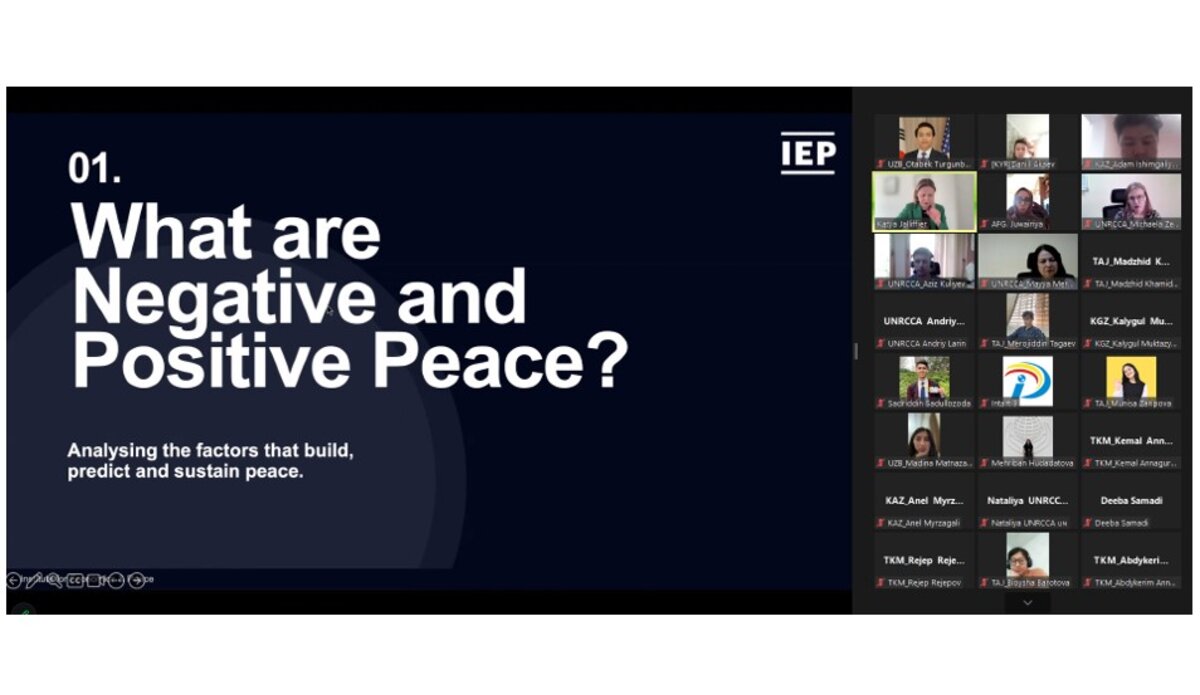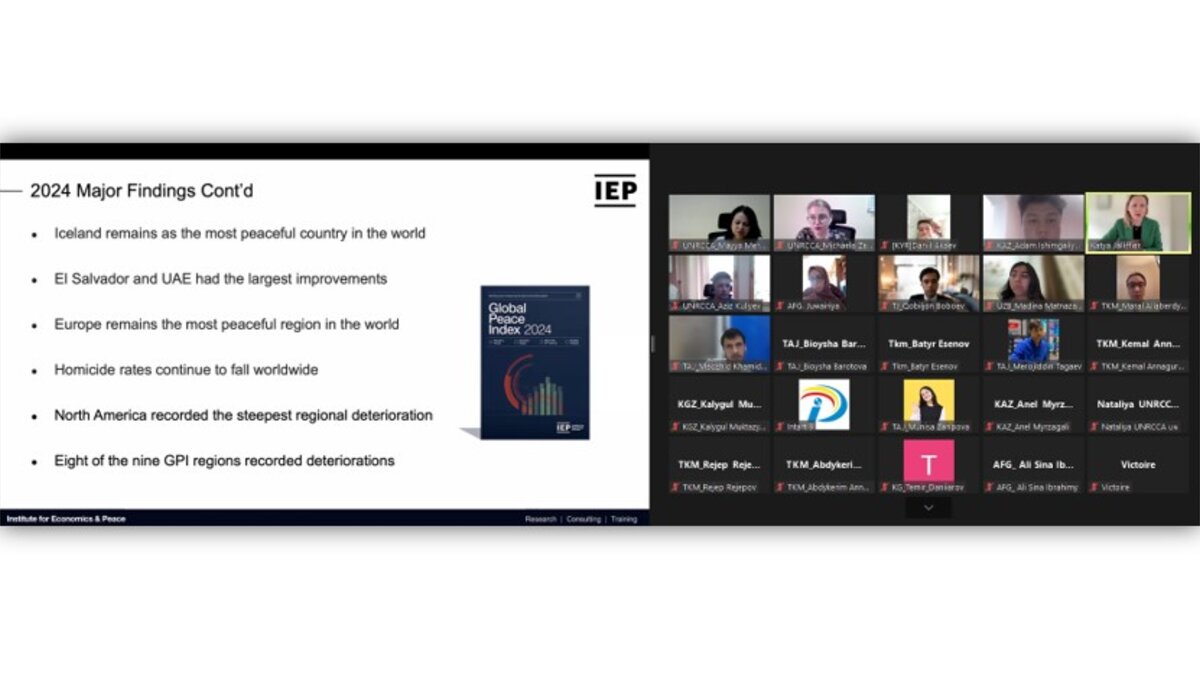 On 2 July, the UNRCCA Preventive Diplomacy Academy welcomed the Institute for Economics and Peace (IEP) to learn about the latest developments in the peace and security realm. The IEP is a research-focused independent think tank developing global and national indices, calculating the economic cost of violence, analysing country-level risk and fragility, and analysing Positive Peace.